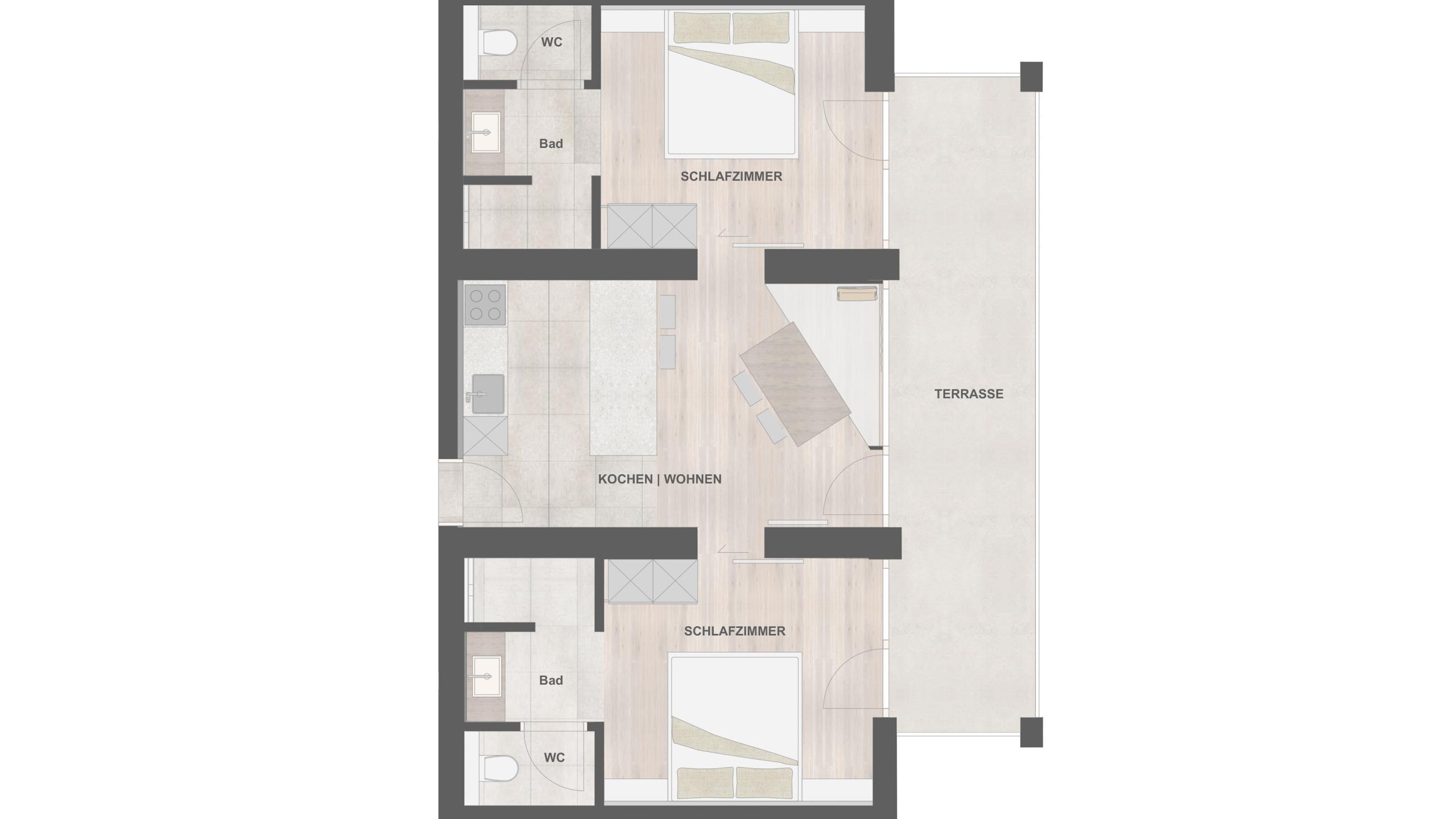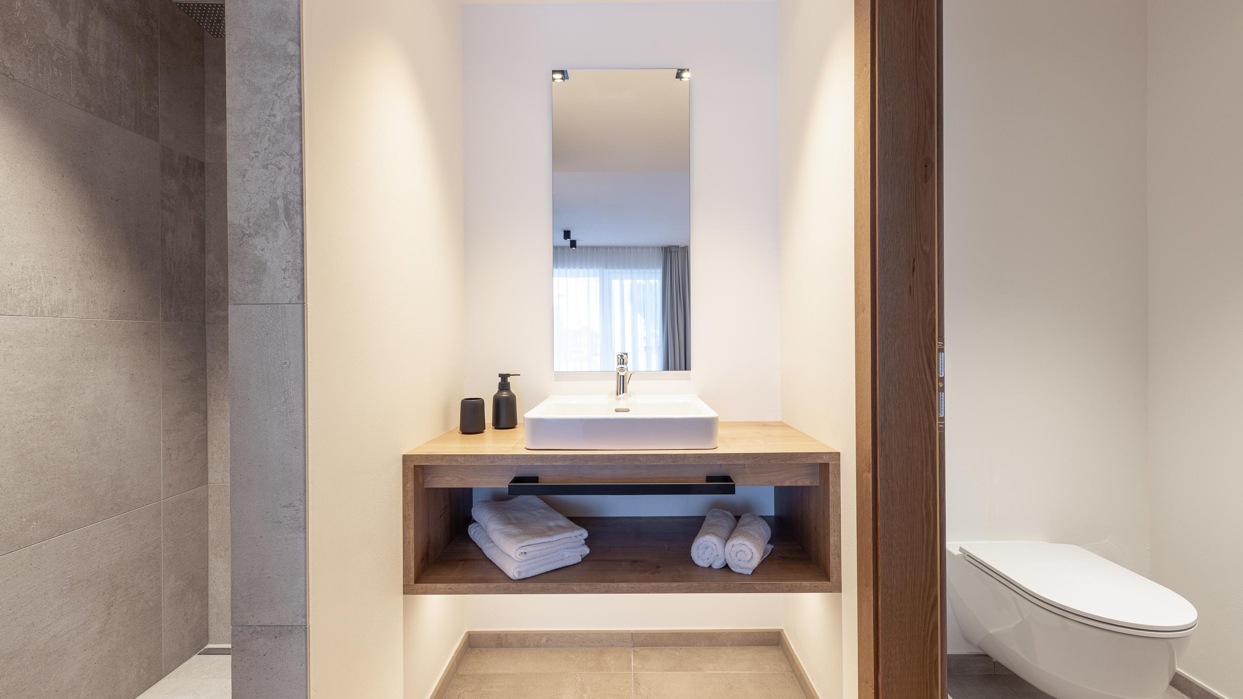 - Two bedrooms with sliding doors, each with direct access to its own en-suite bathroom and toilet